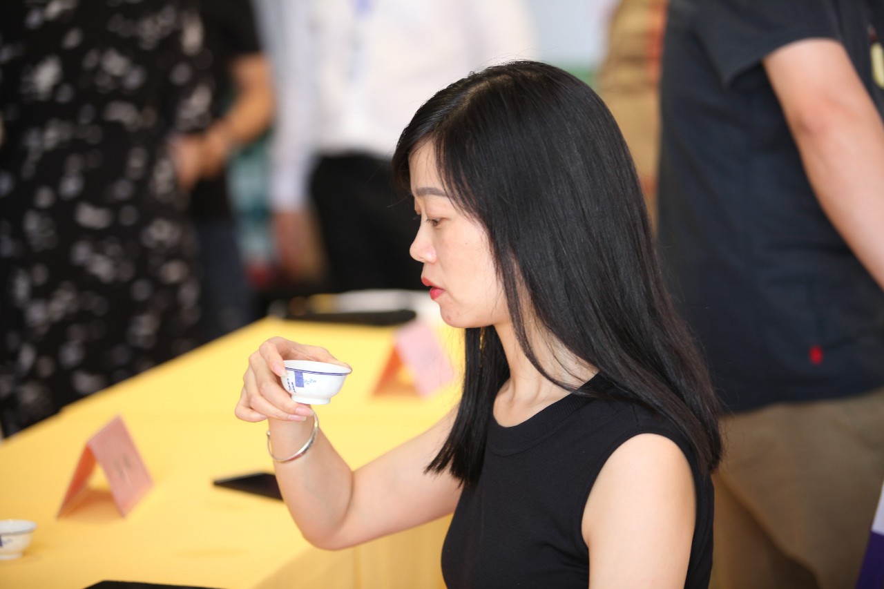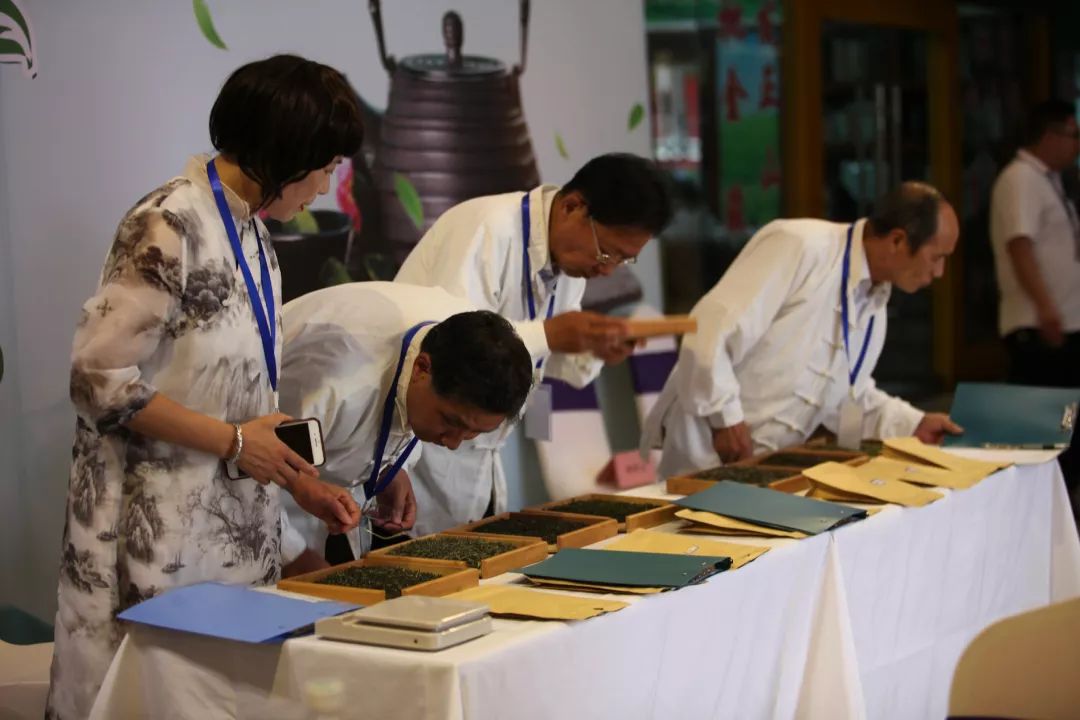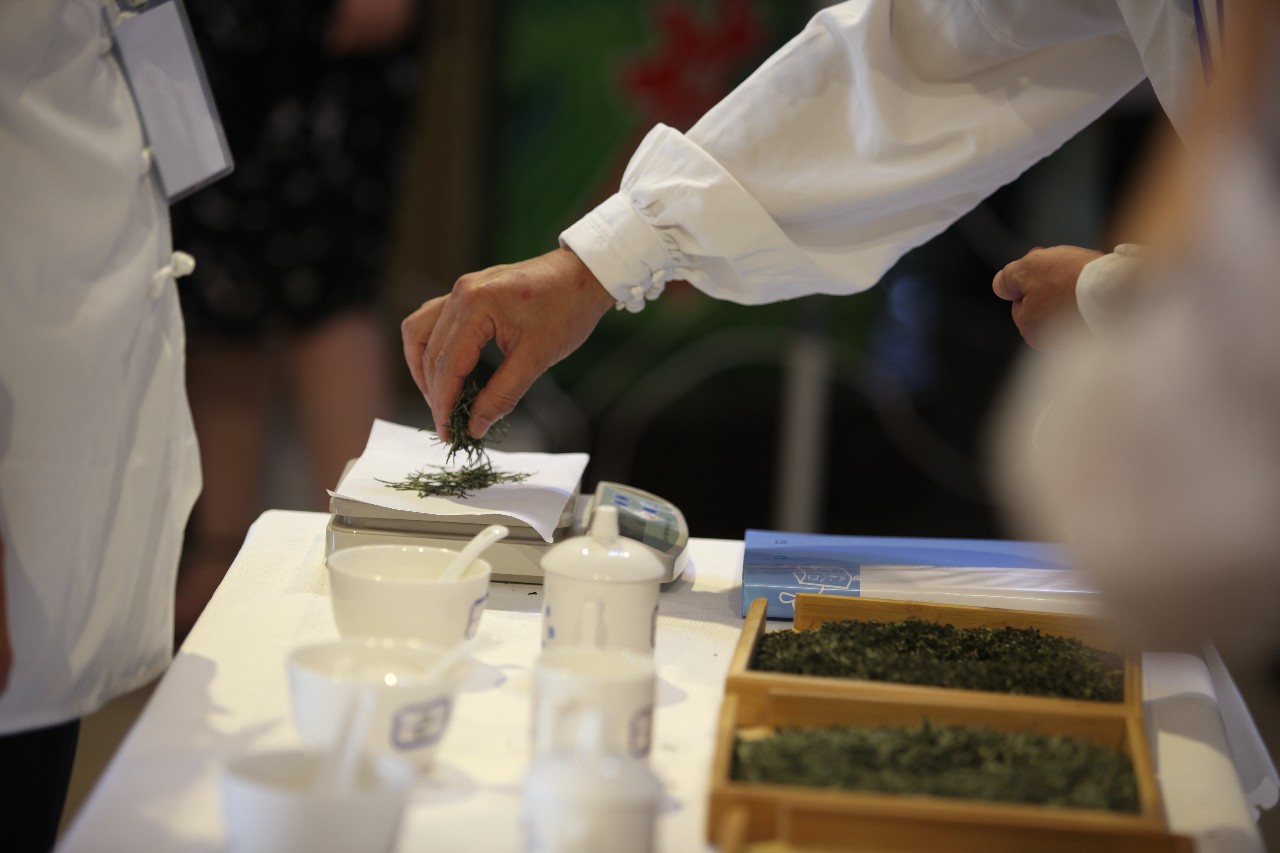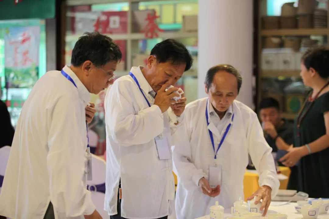 斗茶会现场座无虚席、茶香飘扬,几位专家评审对茶样的滋味、香气、外形、叶底、汤色等分别评分,评委们或是对着茶叶仔细查看,或是细细品闻杯盖上的香味,又或是喝上一口细微感受茶入喉的清甜。