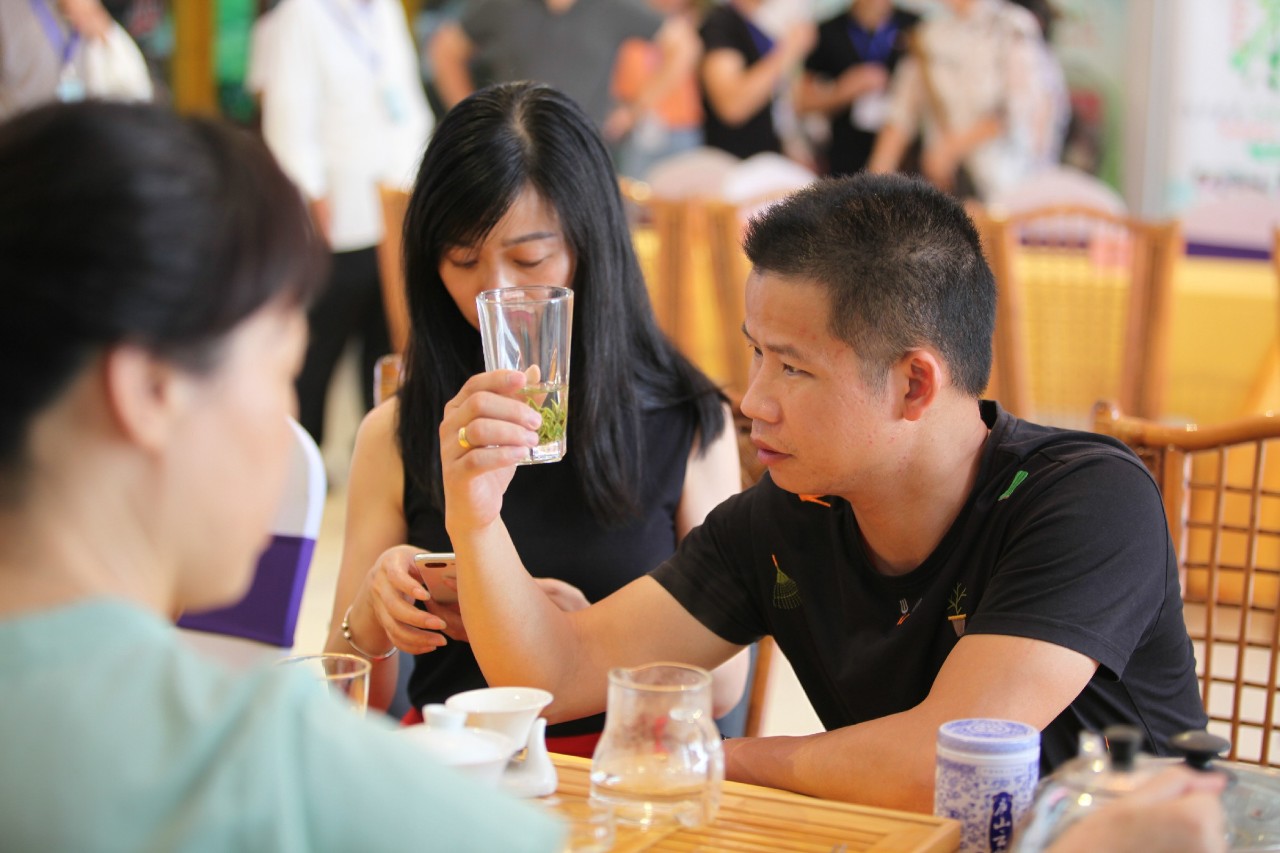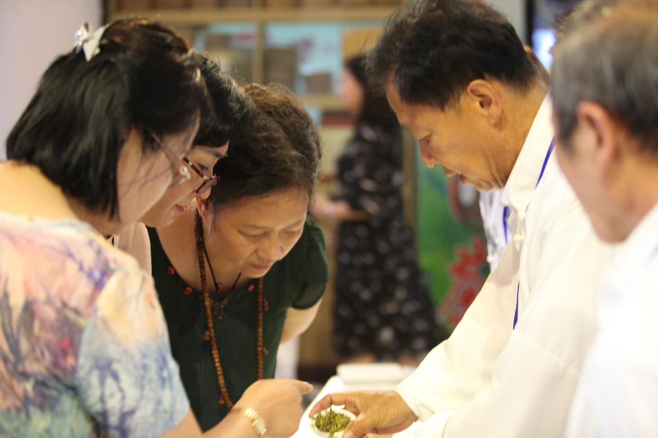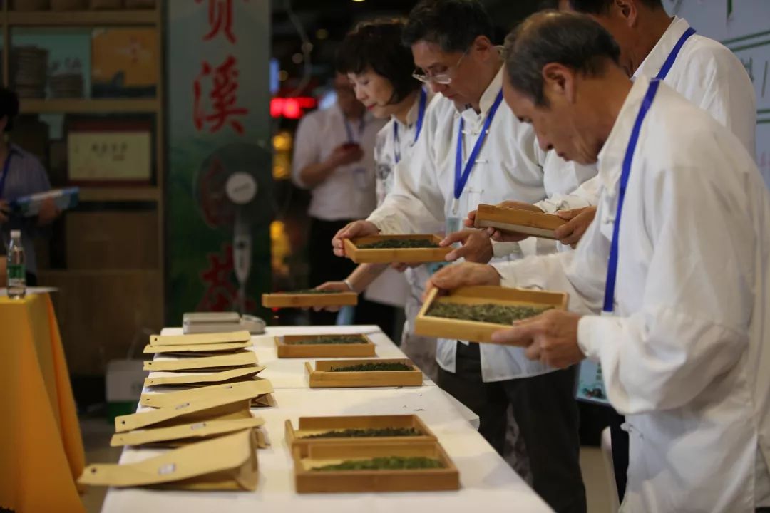 斗茶会现场座无虚席、茶香飘扬,几位专家评审对茶样的滋味、香气、外形、叶底、汤色等分别评分,评委们或是对着茶叶仔细查看,或是细细品闻杯盖上的香味,又或是喝上一口细微感受茶入喉的清甜。