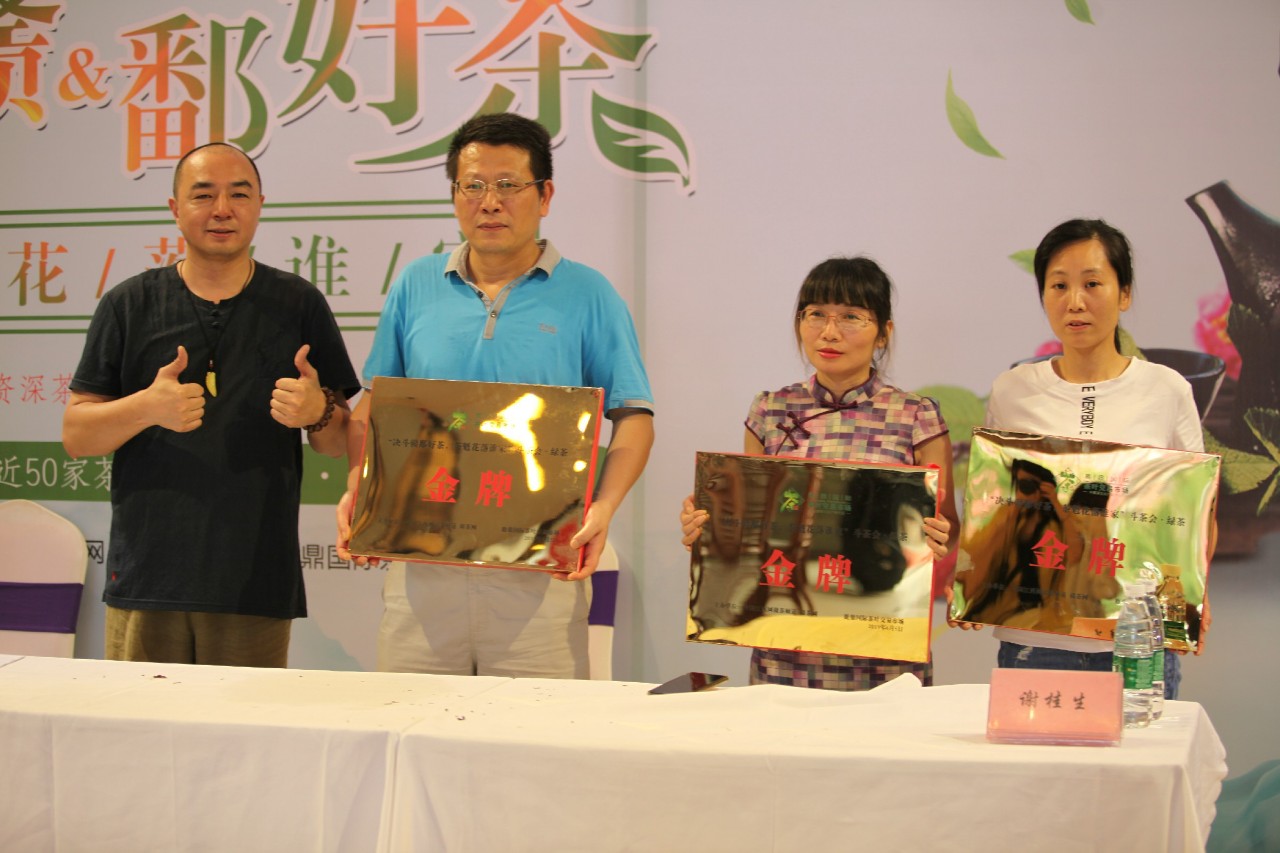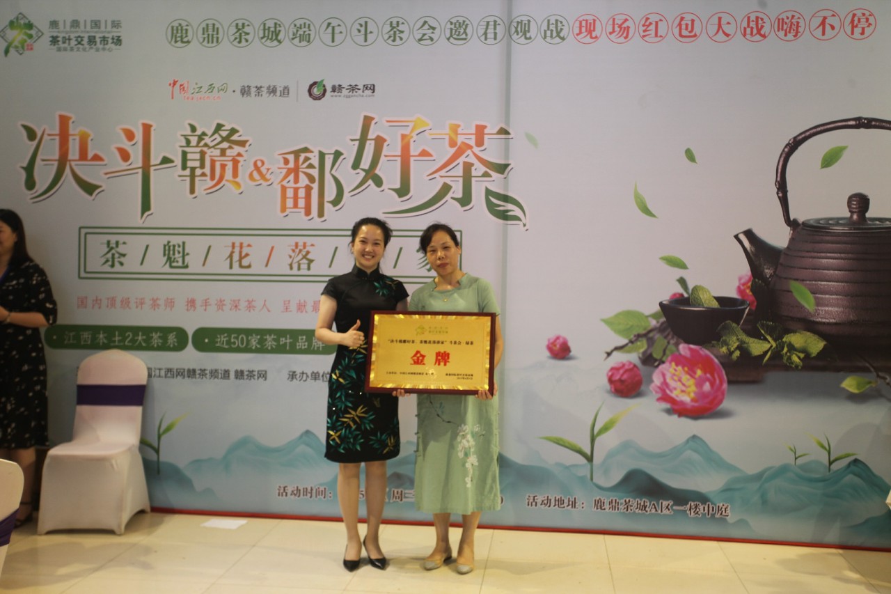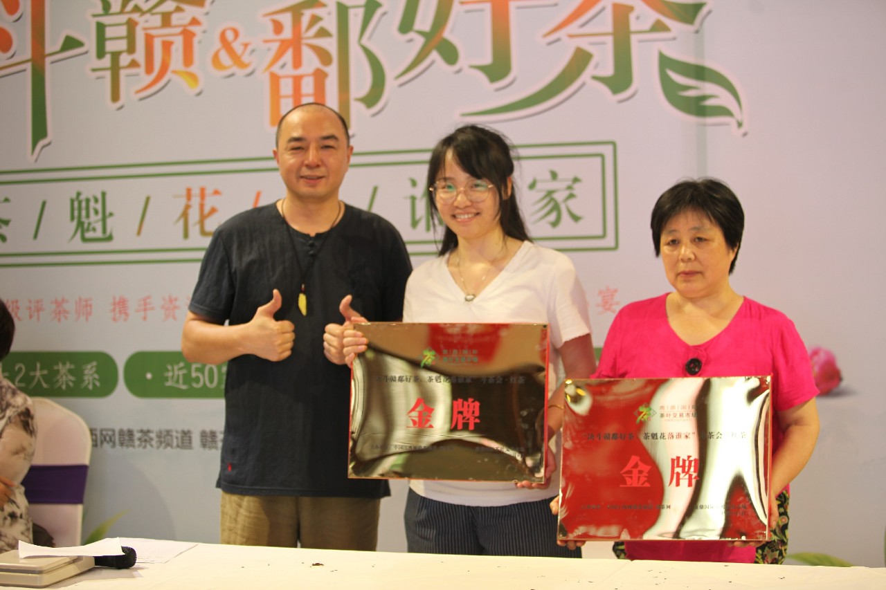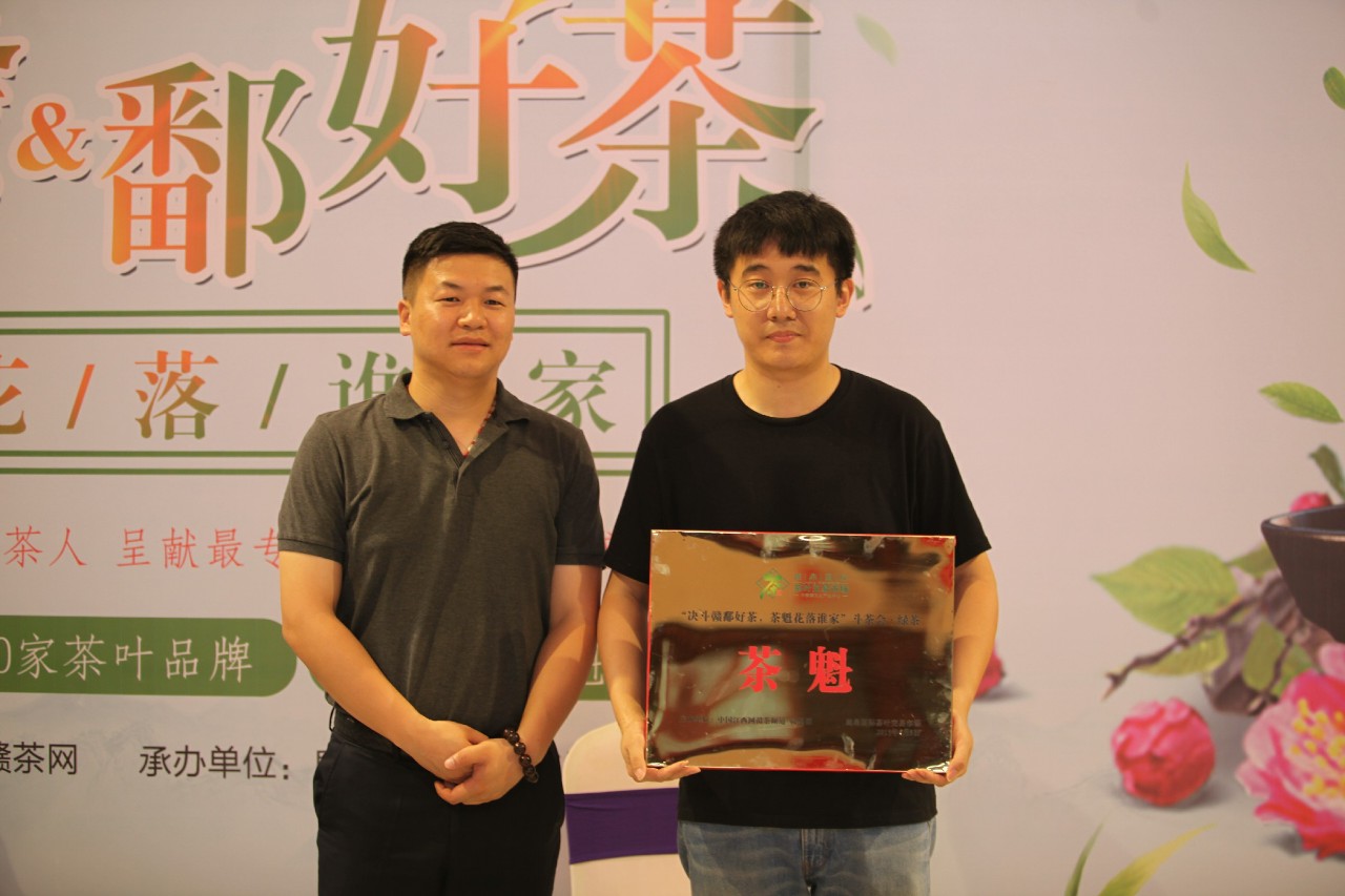 在获奖名单揭晓前,大家已经围拥在舞台边翘首以待,静候最终结果。获得本次斗茶会绿茶金奖的商户分别是:浮梁茶旗舰店、天涯山、鄣公山、大户茶业;获得本次斗茶会红茶金奖的商户分别是:御华轩、漫江红宁红,由江西蓝谷文化创意有限公司总经理王斌为其颁发奖牌。随着获奖商户代表依次登台,人群中不断爆发出热烈的掌声,直至最后绿茶、红茶茶魁登场时,现场气氛达到顶点。获得本次斗茶会绿茶茶魁的商户是:协和昌,现场由鹿鼎国际(南昌)茶叶交易市场总经理饶鸿石为其颁发奖牌;获得本次斗茶会红茶茶魁的商户是:浮梁茶旗舰店,由江西万氏企业集团董事长助理、江西蓝谷文化创意有限公司董事长石圆圆为其颁奖。斗茶茶魁代表了各类茶品牌制作技艺的至高水准,也是制茶人的至高殊荣,在此恭喜以上所有获奖商户。